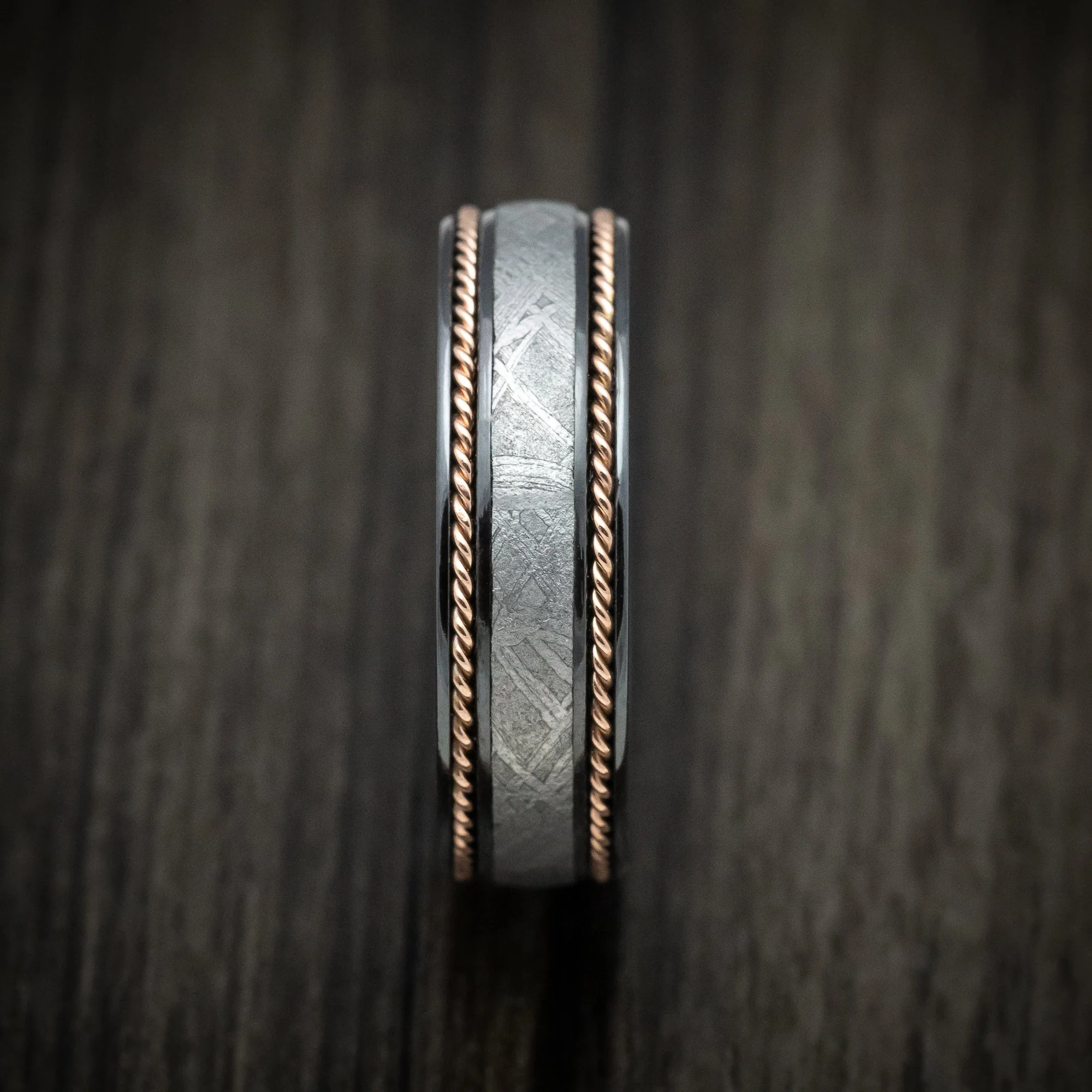 Black Titanium or Black Zirconium Custom Men's Ring with Gibeon Meteorite and 14K Gold Braid Inlays
