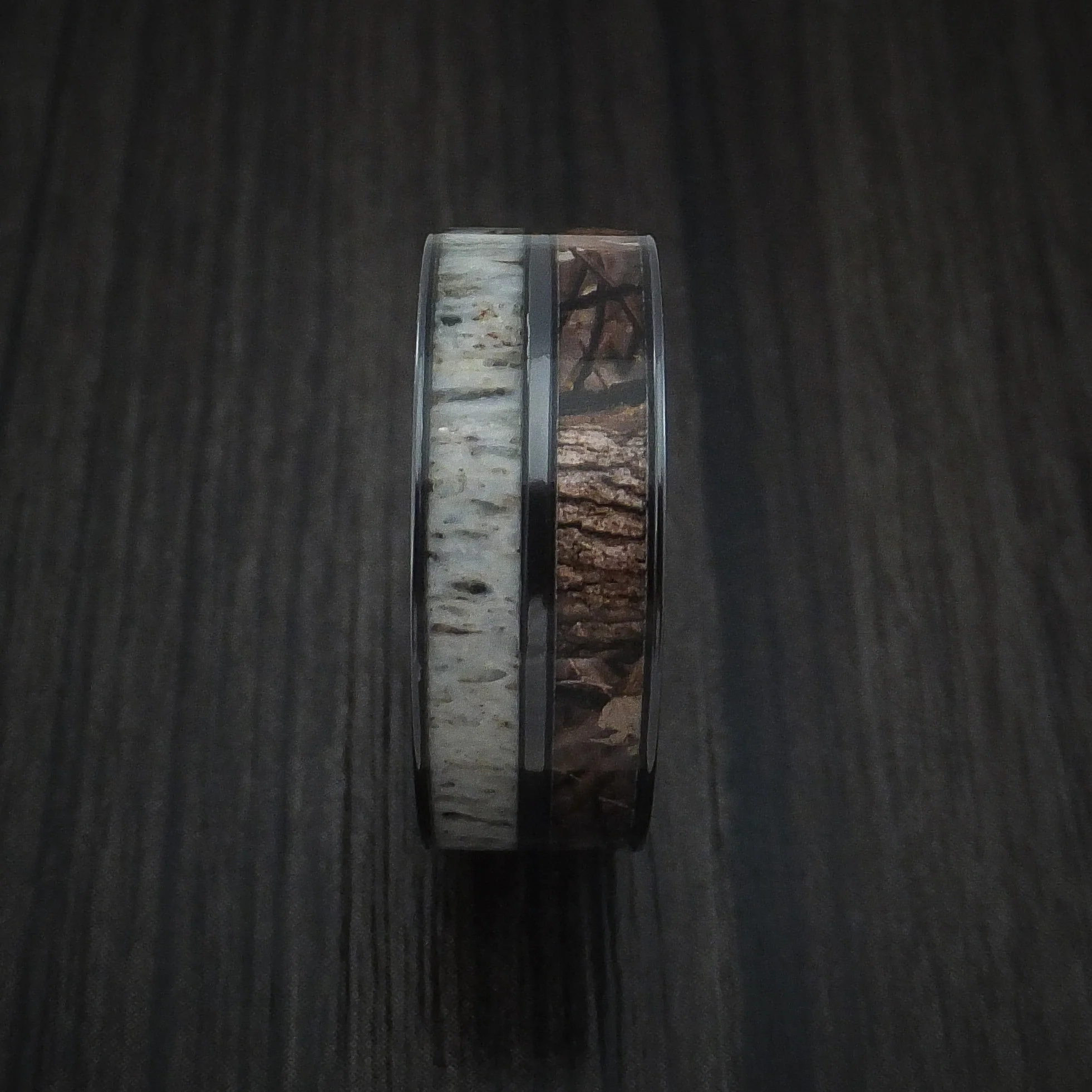 Black Zirconium Men's Ring with Camo and Antler Inlays Custom Made Wedding Band