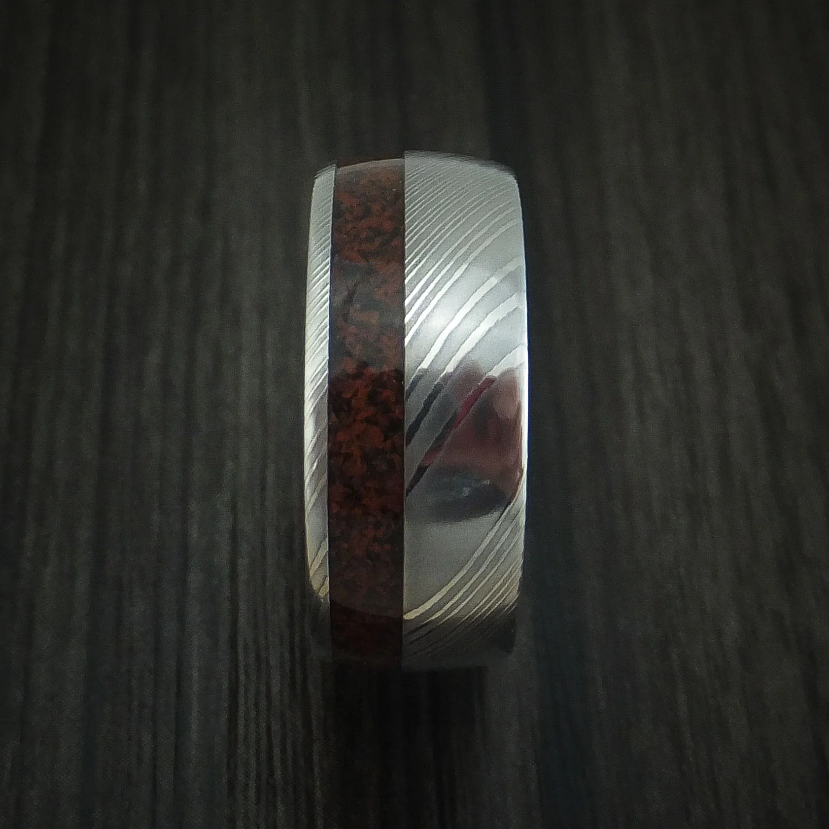 Damascus Steel and Red Dinosaur Bone Men's Ring Custom Made Fossil Band