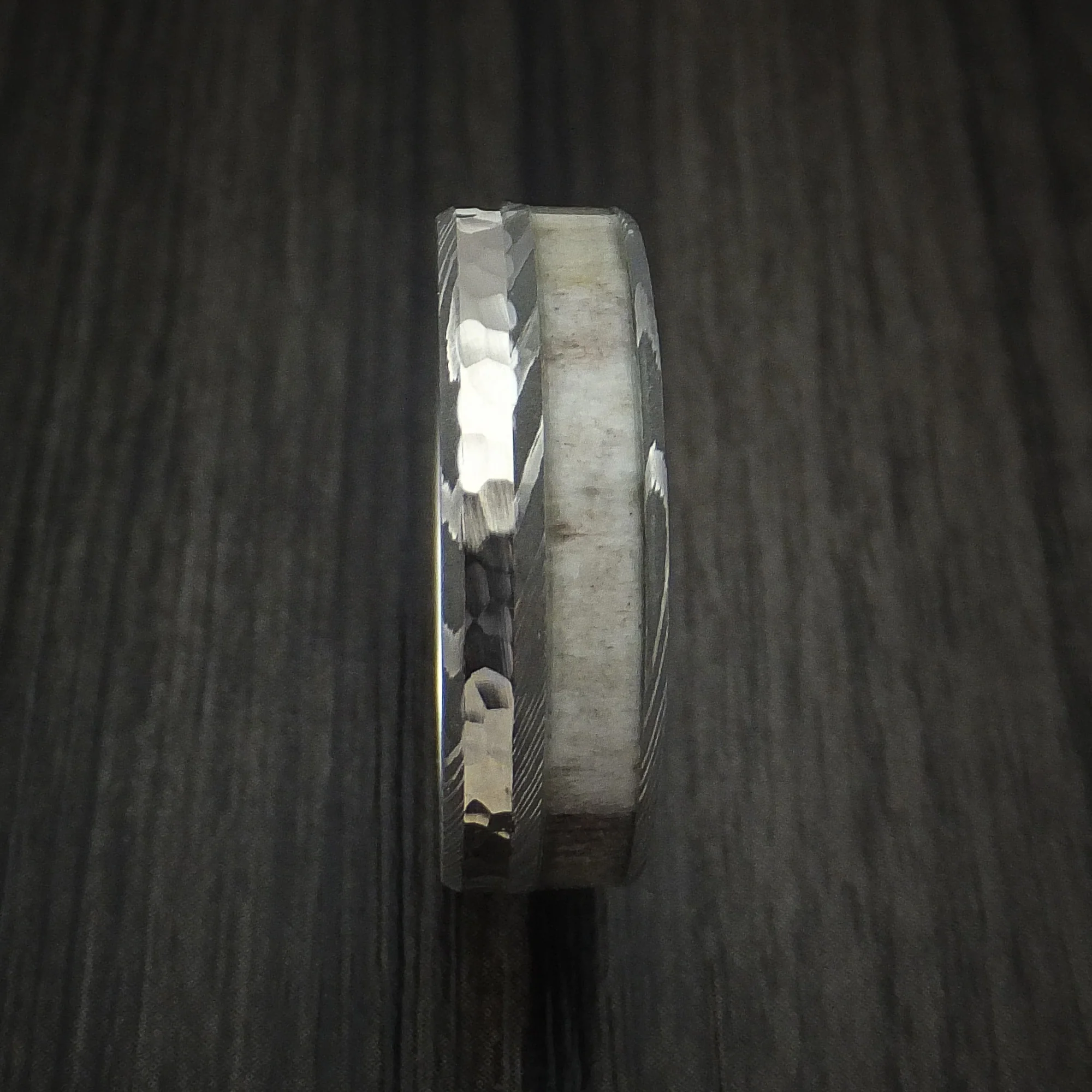 Damascus Steel with Hammered 14k White Gold and Antler Custom Made Men's Ring