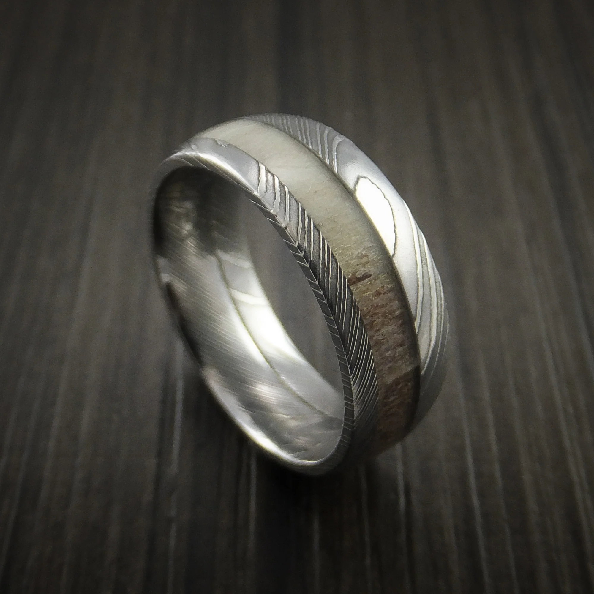 Antler Men's Ring inlaid in Solid Damascus Steel Hunters Wedding Band Custom Made