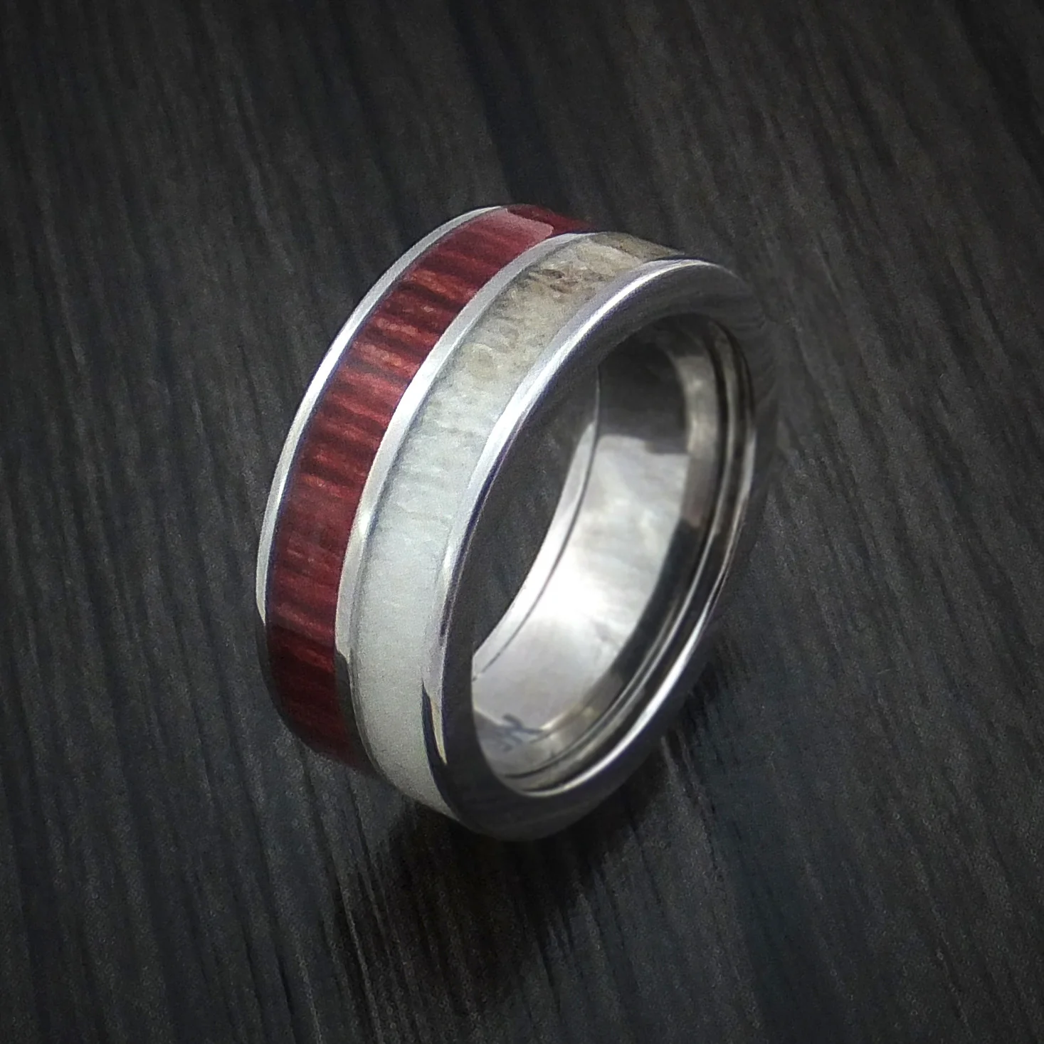 Titanium Men's Ring with Red Heart Wood and Antler Inlays Custom Made