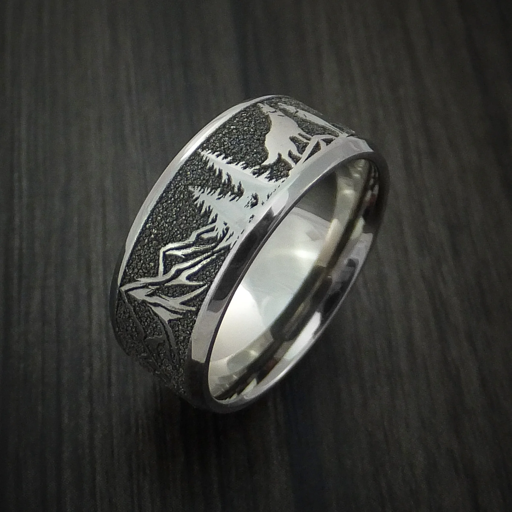 Titanium Men's Ring with Wolf and Mountain Pattern Hunter Band Custom Made